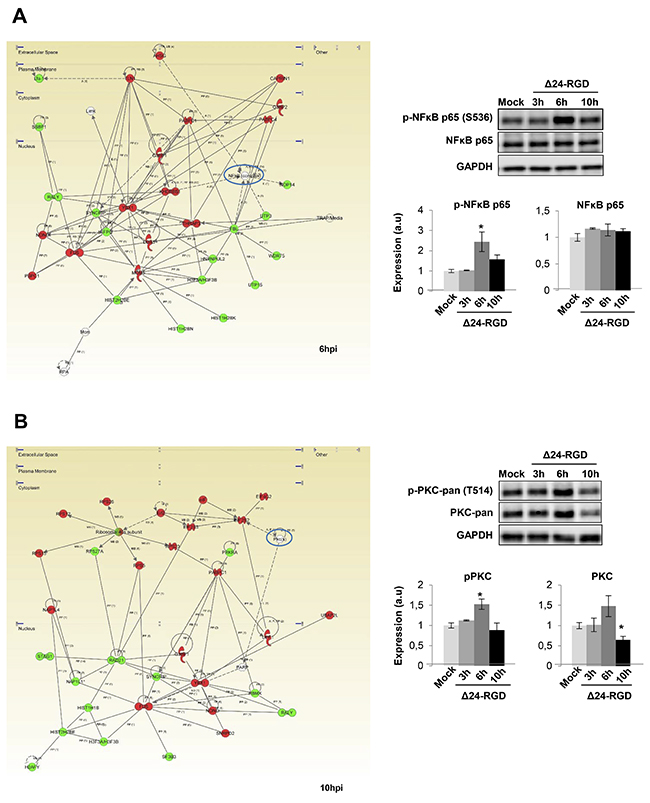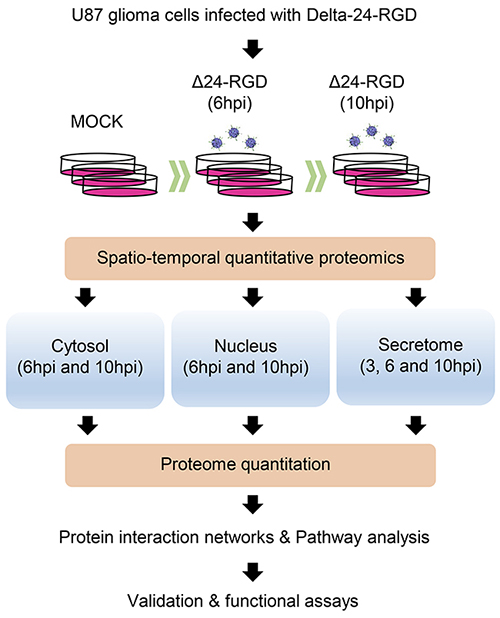 It is well known that for an efficient cell lysis and adenoviral spread, Delta-24-RGD induces massive autophagy [19–22], a late response specifically regulated, in part, by the C-Jun N terminal kinases [23]. Understanding the cellular mechanisms that orchestrate the glioma cell response to oncolytic Delta-24-RGD virus will aid to develop novel vectors with enhanced capability to release viral progeny and, as a result, to elicit a more potent oncolytic effect. One of the potential avenues to increasing Delta-24-RGD potency that remains understudied is the monitoring of cellular intermediates underlying the glioma cell response prior to the activation of the autophagic process. In order to characterize the missing links in the biochemical understanding of the signaling pathways impaired in glioma cells during early phases of Delta-24-RGD infection, we have used a discovery platform combining a subcellular mass spectrometry based-quantitative proteomics approach, physical and functional interaction data, and biochemical approaches. The integration of these data will allow us to uncover means by which the molecular pathways are chronologically regulated during Delta-24-RGD infection at early time points.
