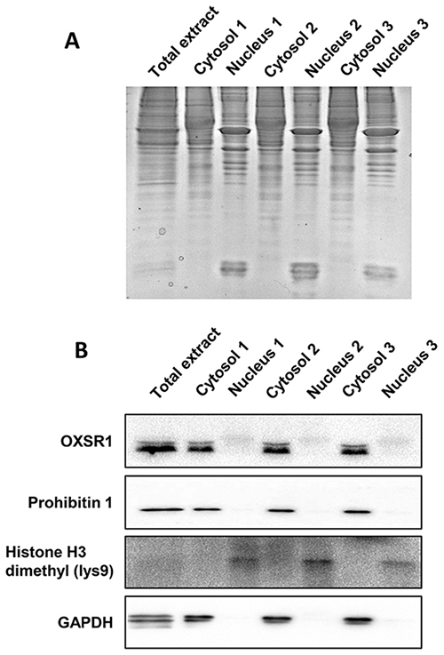 Figure 2: Validation of our enrichment procedure. (A) Cytosolic and nuclear fractions resolved by SDS-PAGE electrophoresis. As shown in the upper panel, cytosolic and nuclear proteomes differ in the band profiles. (B) Specificity analysis by Western-blotting against specific cytosolic proteins (OXSR1, GAPDH), mitochondrial marker (Prohibitin-1) and nuclear histone (dimethyl-lysine 9 of histone H3).