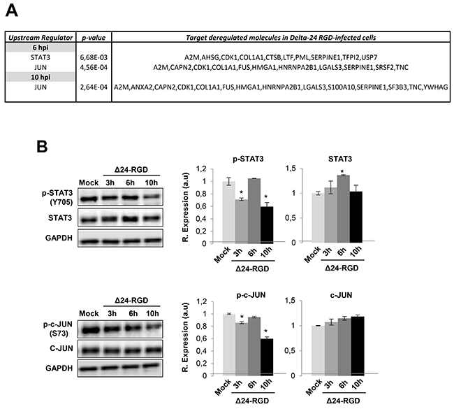 From a biological point of view, we have partially deciphered the molecular events triggered by Delta-24-RGD prior to the induction of autophagy in glioma cells. Moreover, we have established a working pipeline for the future monitorization of the intracellular and extracellular proteostatic derangements induced by Delta-24-RGD-based vectors in pre-clinical glioma models. The high-throughput, and straightforward workflow applied in this study has allowed us the generation of quantitative molecular maps that may be useful to the development of complementary adenoviral based-vectors to increase the specificity and potency against glioma. Finally, we consider that the evaluation of the cytokine panel modulated by Delta-24-RGD might be of potential clinical interest, with the aim to monitoring the immune response elicited by Delta-24-RGD treatment in patients that participate in clinical trials where this therapeutic vector is being supplied.