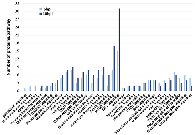 MMA, JFI and ES designed and supervised the complete study. AGM performed proteomic experiments, bioinformatics analysis, protein validation and signaling pathway characterizations. AZ, and EG evaluated the cytokine profiling and the statistical analysis. MGM performed time-dependent infectivity experiments. JFI and ES performed mass spectrometry analysis and data interpretation. ES wrote the paper.
