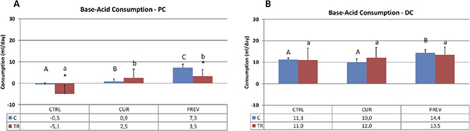 Figure 1: The pH in the SHIME system is maintained by pre-set pH controllers at 5.6–5.9 in the proximal colon (PC) and at 6.6 to 6.9 in the distal colon (DC) to ensure optimal environments for microbiota. As the reactors acidify during changes in microbial activity, base is added. These results show acid and base consumption during control (C) and chemotherapy/antibiotic treatment (TR) periods for the control (CTRL), curative (CUR), and preventative (PREV) arms with the probiotic with digestive enzymes supplement. Results are shown for the reactors corresponding to the PC (A) and DC (B), and represent the average base/acid consumption over the entire control (n = 6 measurement) and treatment (n = 12) period. (*) represents statistically significant differences between C and TR (i.e. before and after 5-FU/vancomycin addition to the rea ctors, respectively). The different letters above the bars denote statistical comparisons between the indicated groups where uppercase or lowercase letters define distinct comparator groups; p < 0.05 was considered significant.