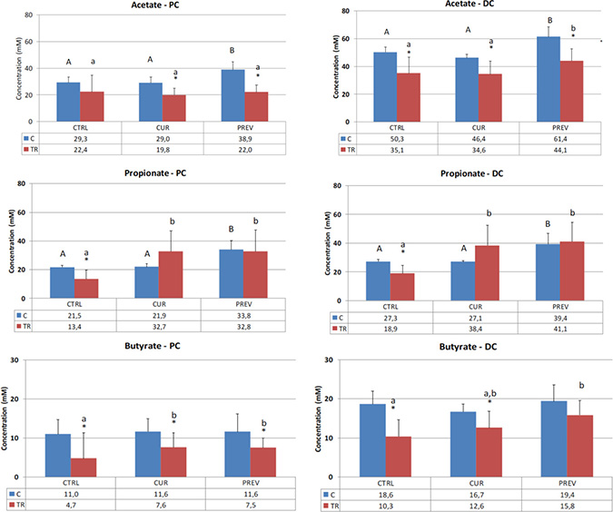 Figure 2: Effect of curative and preventative administration of a probiotic with digestive enzymes supplement on short chain fatty acid production in SHIME reactors corresponding to the proximal colon and distal colon. Average acetate, propionate, and butyrate production, as indicated, over the control (C) (n = 6) and treatment (TR) (n = 12) periods for the control (CTRL), curative (CUR), and preventative (PREV) arms given the probiotic with digestive enzymes supplement is presented. (*) represents statistically significant difference relative to the preceding period. The different letters above the bars denote statistical comparisons between the indicated groups where uppercase or lowercase letters are used to delineate the distinct comparator groups, and p < 0.05 was interpreted as significant.