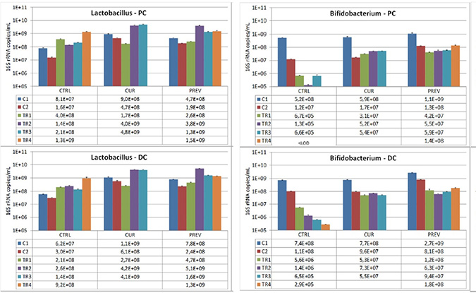 Figure 3: Analysis of modulation of the Lactobacillus and Bifidobacterium composition by the probiotic with digestive enzymes supplement. The effect of a curative (CUR) and preventive (PREV) administration of the probiotic with digestive enzymes supplement as compared to a control SHIME (CTRL) on luminal Lactobacillus (left panels) and Bifidobacterium (right panels) levels (16S rDNA copies/mL) in the proximal (PC; top panels) and distal colon (DC; bottom panels). The data are represented for the control weeks (C1, C2) and treatment weeks (TR1, TR2, TR3, and TR4. It should be noted that 5-FU/vancomycin was administered to the system in TR1 and discontinued in TR2–TR4. Preventative administration of the probiotic with digestive enzymes supplement was being administered throughout the control periods (C1 and C2), while curative supplementation of the probiotic with digestive enzymes formulation was initiated and maintained at TR1-TR4. (*) indicates statistically significant differences relative to the preceding period, while different letters indicate a statistical difference between different treatments; p < 0.05.