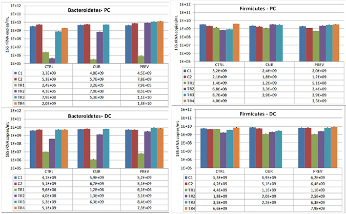 Figure 4: Changes in the dominant phyla of beneficial gut microbes, Bacteriodetes and Firmicutes, by the probiotic with digestive enzymes supplement. The effect of a curative (CUR) and preventive (PREV) administration of the probiotic with digestive enzymes supplement as compared to a control SHIME (CTRL) on luminal Bacteroidetes, and Firmicutes levels (16S rDNA copies/mL) in the proximal (PC; top panels) and distal colon (DC; bottom panels). The data are represented for the control weeks (C1, C2) and treatment weeks (TR1, TR2, TR3, and TR4. It should be noted that 5-FU/vancomycin was administered to the system in TR1 and discontinued in TR2-TR4. Preventative administration of the probiotic with digestive enzymes supplement was being administered throughout the control periods (C1 and C2), while curative supplementation of the probiotic with digestive enzymes formulation was initiated and maintained at TR1-TR4. (*) indicates statistically significant differences relative to the preceding period, while different letters indicate a statistical difference between different treatments; p < 0.05.