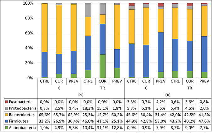 Figure 5: Addition of the probiotic with digestive enzymes supplement to the SHIME modulates the microbial communities at the phylum level. Abundance (%) of the dominant phyla in the lumen of the proximal (PC) and distal colon (DC) of the SHIME upon a curative (CUR) and preventive (PREV) administration of the probiotic with digestive enzymes supplement as compared to control (CTRL) the end of the control week 2 (C) and treatment week 4 (TR) period.