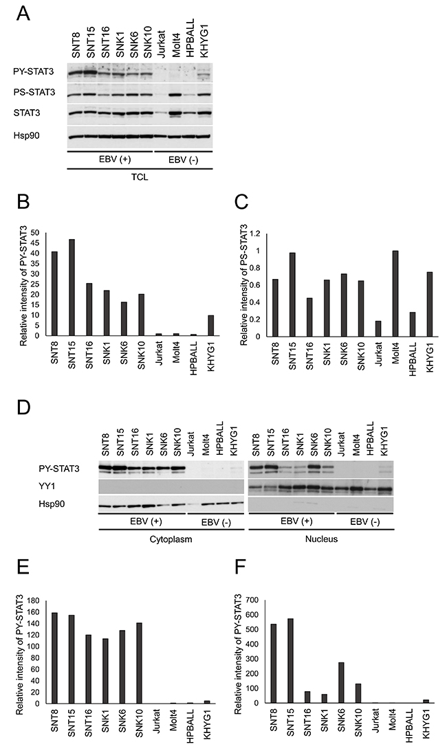 Figure 1: STAT3 is constitutively activated in EBV-positive T- or NK-cell lines. (A) Western blotting for the phosphorylation of cell lines. Total cell lysates (TCL) were prepared, resolved by SDS-PAGE, and immunoblotted with antibodies, as indicated. STAT3 is constitutively phosphorylated in EBV-positive T- or NK-cell (EBV-T/NK-cell) lines but not in EBV-negative T- or NK-cell lines. Tyrosine-phosphorylated STAT3 (PY-STAT3) is detected in EBV-T/NK cell lines. Serine-phosphorylated STAT3 (PS-STAT3) is detected in all cell lines. EBV-negative cell lines do not exhibit or demonstrate a little phosphorylation of tyrosine. (B and C) the relative intensities of PY-STAT3 (B) and PS-STAT3 (C) bands of (A) were determined as ratio to total STAT3 by densitometry. MOLT4 was determined as a control. (D) Western blotting for STAT3 localization in EBV-T/NK-cell lines. Tyrosine-PY-STAT3 is localized in the nucleus in EBV-T/NK-cell lines but not in EBV-negative T- or NK-cell lines. Hsp90 and YY1 are proteins that were localized to the cytoplasm and nucleus, respectively. (E and F) the relative intensities of PY-STAT3 bands (D) of cytoplasm (E) and nucleus (F). The intensites were determined as ratio to Hsp90 (E) and YY1 (F), respectively by densitometry. MOLT4 was determined as a control.