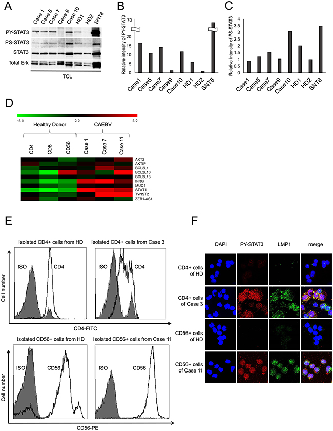 We validated the results mentioned above in patient-derived cells. In CAEBV, EBV-positive cells are detected in the peripheral blood. In this study, 14 patients with CAEBV (aged 18-64 years; five males, nine females; CD4 type: n = 4; CD8 type: n = 4; CD56 type: n = 3; CD4 and CD56 double infection: n = 2; and CD4 and CD8 double infection: n = 1) were investigated. Table 1 presents the clinical findings, phenotype, and EBV DNA load of infected cells. The clonal proliferation of infected cells was detected in the peripheral blood mononuclear cells (PBMCs) of all patients. The EBV DNA load of the patient-derived PMBCs was 1.7×103-2.6×105 (mean: 9.2 × 104) copies/μg DNA. We studied the STAT3 activation in the PBMCs obtained from five patients; the cells were isolated from the peripheral blood, immediately lysed, and used for western blotting (Figure 2A). Figures 2B and 2C show the relative intensity of the bands by the densitometry analysis. The lysate of SNT8 cells was a positive control. The phosphorylation of serine-727 was detected in the samples from patients as well as those from healthy donors. On the other hand, tyrosine-705 of STAT3 was significantly phosphorylated in four of five patient cells. The non-detection of the tyrosine phosphorylation in Case 9 could present the negative or weak activation of STAT3, or could be attributed to the low rate of EBV-positive cells in the PBMCs (Table 1), because STAT3 was constitutively expressed in PBMCs. Taken together, the phosphorylation of both tyrosine-705 and serine-727 was detected in patients’ samples. In addition, we investigated the expression of STAT3-inducible genes by the microarray analysis. The fractions containing EBV-infected cells were isolated from the PBMCs of patients, Cases 1, 7, and 11, whose EBV-positive cells were CD4-, CD8-, and CD56-positive cells, respectively. For the isolation, we used antibody-conjugated magnetic beads against surface markers on infected cells. In addition, the RNA was extracted from cells and used for the microarray analysis. Figure 2D shows that the expression of STAT3-inducible genes, including IFN-γ, was generally enhanced in the patient-derived T- or NK-cell fractions that included EBV-positive cells. Furthermore, we examined the activation and localization of STAT3 in EBV-positive T- or NK-cells from the patients. In Cases 3 and 11, EBV-infected cells were CD4- and CD56-positive, respectively (Table 1). We isolated CD4- or CD56-positive cells from the PBMCs of patients and healthy donors using antibody-conjugated magnetic beads. Figure 2E shows the flow cytometry for the isolated cells, confirming that a majority of the isolated cells were positive for CD4 or CD56. Figure 2F shows the localization of tyrosine-phosphorylated STAT3 (PY-STAT3) in isolated CD4- or CD56-positive cells. PY-STAT3 was detected not only in the cytoplasm but also in the nucleus of patient-derived CD4- or CD56-positive cells, whereas it was not detected in CD4- or CD56-positive cells from healthy donors. EBV infection was determined by the LMP1 expression in patient-derived CD4- or CD56-positive cells. These results indicated that STAT3 was constitutively activated in PBMCs fractions containing EBV-infected T or NK cells in CAEBV. In Case 3 and 11, STAT3 was constitutively activated in EBV-infected T or NK cells. At present, however, it is not clear whether this activation is specific to EBV-infected cells, because we could not examine infected and un-infected cells separately.