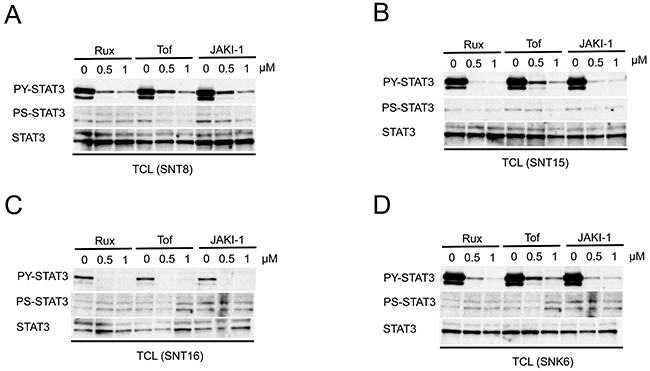 Figure 3: JAK inhibitors suppress the constitutive phosphorylation of STAT3 in EBV-positive T- or NK-cell lines. (A-D) Western blotting for the phosphorylation of cell lines treated with JAK inhibitors. Total cell lysates (TCL) were prepared, resolved by SDS-PAGE, and immunoblotted with antibodies, as indicated. The phosphorylation of tyrosine-705-STAT3 in cell lines was suppressed by JAK inhibitors in a dose-dependent manner: SNT8 (A); SNT15 (B); SNT16 (C); and SNK6 (D). The phosphorylation of serine-727 was not clearly suppressed. Rux, ruxolitinib; Tof, tofacitinib; JAKI1, Jak inhibitor 1.