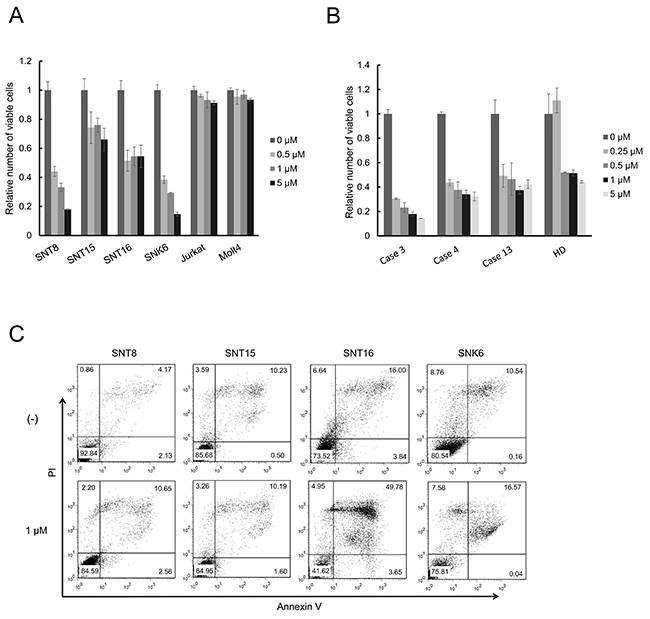 Figure 4: Ruxolitinib suppresses viable cell number of EBV-infected T or NK cells. (A) EBV-infected T- or NK-cell lines were treated with ruxolitinib, as indicated, for 48 h, and the number of viable cells was estimated by an XTT assay and expressed in arbitrary units. The data are shown as mean±standard deviations (SD) of three independent experiments. (B) the PBMCs from 3 patients with CAEBV and 1 healthy donor were treated with ruxolitinib, as indicated, in the presence of IL-2 for 72 h, and the viable cell number was estimated by an XTT assay and expressed in arbitrary units. The data are presented as mean±SD of three independent experiments. (C) EBV-infected T- or NK-cell lines were treated with ruxolitinib for 48 h, as indicated, and then analyzed. Cells were stained with Annexin V and PI and subsequently analyzed by flow cytometry.