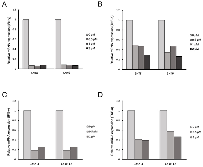 From the three inhibitors, we selected ruxolitinib, the effective concentration of which was identical to that of its clinical use. We investigated the effects of ruxolitinib on the proliferation and survival of EBV-positive T- or NK-cells. The XTT assay demonstrated that ruxolitinib suppressed the viable cell number of EBV-positive T- or NK-cell lines in a dose-dependent manner (Figure 4A). In addition, ruxolitinib suppressed a viable cell number of CAEBV patient-derived PBMCs in a dose-dependent manner (Figure 4B). Ruxolitinib also suppressed the number of healthy donor-derived PBMCs. However, under the concentration of 0.25 μM, which can be actually achieved in patients, the number of patient-derived PBMCs was decreased whereas that of healthy donor-derived PBMCs was not. As shown in Figure 4C, ruxolitinib induced cellular apoptosis in SNT16, although it was not remarkable in SNT8, SNT15, and SNK6 cells. Finally, we investigated the effects on cytokine production. Figures 5A and 5B show that ruxolitinib suppressed the mRNA production of inflammatory cytokines, IFN-γ and TNF-⁑ in EBV-positive T- or NK-cell lines. Furthermore, ruxolitinib suppressed the mRNA production of inflammatory cytokines IFN-γ (Figure 5C) and TNF-⁑ (Figure 5D) in the CAEBV patient-derived PBMCs. The mRNA of interleukin-6 (IL-6) was not detected in these cells (data not shown). The viability of each cells was approximately 80%, and 60-80%, in the cell lines and patients’ cells, respectively (Supplementary Figure 3).