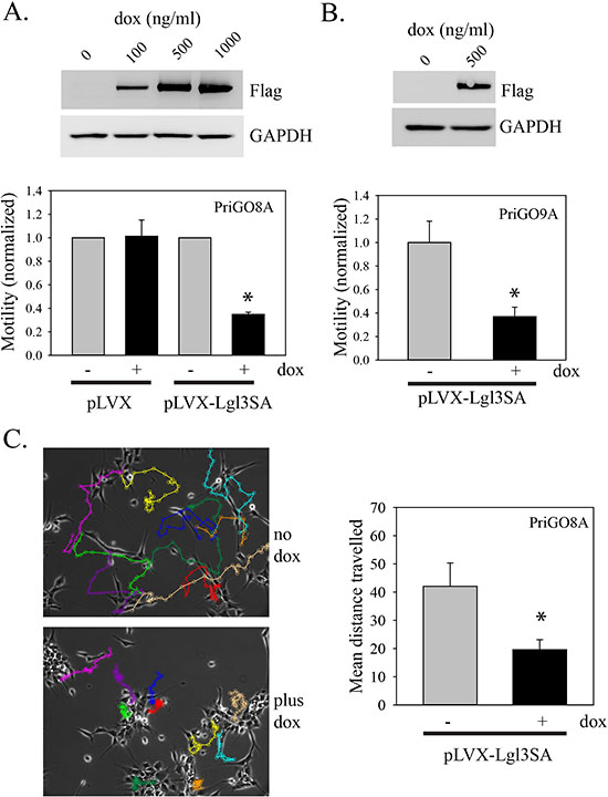 Figure 2: Inhibition of PriGO cell motility by Lgl3SA. (A) PriGO8A cells were transduced with Tet activator and either empty vector (pLVX) or vector expressing Lgl3SA (pLVX-Lgl3SA). To confirm inducible expression, cells were treated with doxycycline for 24 h and then analyzed by Western blotting for expression of flag-tagged Lgl3SA and GAPDH as a loading control. The bar graph shows the results of motility assays. Cells were treated with or without 500 ng/ml doxycycline for three days. Equal numbers of cells were then plated in Transwell plates and 24 h later the number of cells that had crossed the membrane was determined. Data are shown normalized to the untreated doxycycline controls and are the mean of three independent experiments each performed in triplicate. (B) Cells from a second patient (PriGO9A) were transduced with tet activator plasmid and vector expressing Lgl3SA. Confirmation of inducible expression and effects on motility were determined as in A. (C) PriGO8A cells transduced with Tet activator and vector expressing Lgl3SA cells were plated in videomicroscopy dishes. After treatment with or without doxycycline for three days, cell movement was recorded by videomicroscopy for 20 h. Tracks of individual cells over 20 h are shown by the colored lines, with each cell assigned a different color. The bar graph shows the mean total distance traveled for ten randomly selected cells under each condition. For all bar graphs in this figure, error bars show the mean ± standard deviation. *indicates a p value < 0.05.