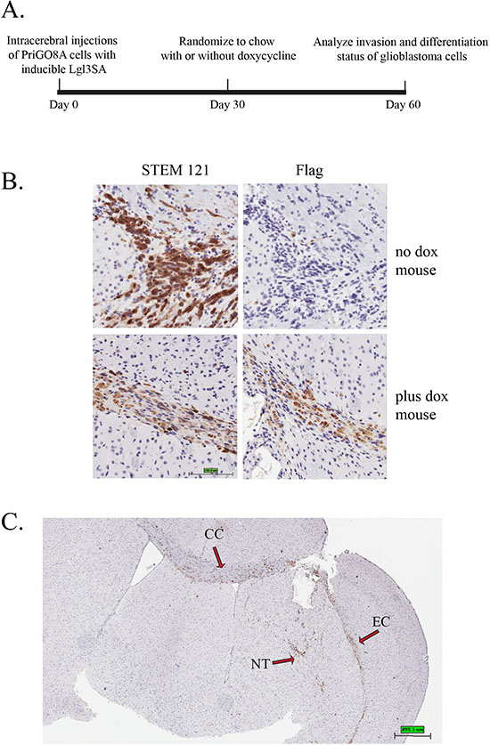 Figure 3: Induction of Lgl3SA in vivo. (A) Experimental design for in vivo invasion experiments. (B) PriGO8A cells were transduced with lentivirus expressing Tet activator and lentivirus expressing Flag-tagged Lgl3SA under control of the doxycycline-inducible Ptight promoter. Cells were then injected intracerebrally in SCID/beige mice. One month after injection of cells, mice were randomized to regular chow or chow with doxycycline. Mice were euthanized one month after randomization. Representative examples of STEM121 and Flag epitope immunohistochemistry performed on serial sections are shown for a mouse that was not treated with doxycycline (top panels) and one that was treated with doxycycline (bottom panels). (C) Brain section from a no doxycycline control mouse showing features of invasion in this model. NT, needle track; CC, corpus callosum; EC, external capsule.
