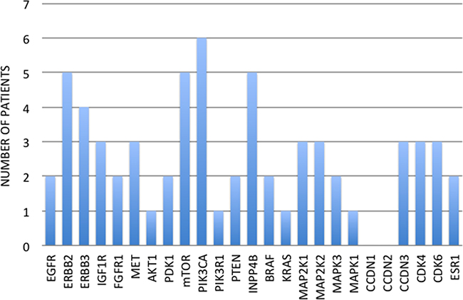 In our study, we found an overall detection rate of mutations higher than that described in the literature. The most frequently mutated genes among the 25 analyzed were PIK3CA and ERBB2 for both primary and relapsed tissues (Figure 5). Mutations of PIK3CA were present in 37.5% of primary tumors and relapsed tissues, while ERBB2 mutations were present in 31.25% of our samples. These percentages are higher than those reported in previous research (30% for PIK3CA and 2–3% for ERBB2) [26, 27], indicating that our patients have been highly selected. It should be noted that only tumors with proved targeted treatment resistance, such as those relapsing or progressing under the targeted treatment, have been included in the study. This process increases the chance of finding the mutations responsible for that resistance. Other genes mutating with high frequency in our study were mTOR and INPP4B, which mutated in 31.25% of primary tumors, and MAP2K2, which mutated in 31.25% of relapsed sites. Overall, the most frequently mutated genes among those investigated are involved in the PI3K/AKT/mTOR and the MAPK signaling pathways. Conversely, mutations in genes involved in the cell-cycle regulation are not as crucial to the mechanism of treatment resistance.