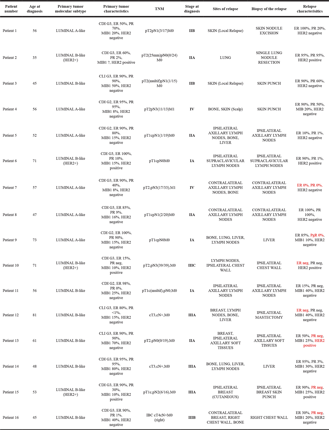 At presentation, 3 patients (18.75%) had Stage IA BC, 4 patients (25%) had Stage IIA, 2 patients (12.5%) had Stage IIB, 3 (18.75%) had Stage IIIA, 1 (6.25%) had Stage IIIB, 1 (6.25%) had Stage IIIC and 2 (12.5%) had Stage IV disease. The most common sites of relapse were lymph-nodes (9 patients, 56.25%), bones (7 patients, 43.75%) and skin (6 patients, 37.5%). As regards the biopsy of the relapse/metastasis, 7 patients (43.75%) underwent skin or soft tissues biopsy, 5 patients (31.25%) had lymph-node biopsy, 2 patients (12.5%) had liver biopsy, one patient (6.25%) underwent single lung metastasis resection, and lastly one patient (6.25%) underwent ipsilateral mastectomy for a local recurrence. In 8 cases (50%), the relapse/metastasis maintained the same immunohistochemical characteristics [i.e. the same hormone receptors (HR) and HER2 status] of the primary tumor, whereas 8 (50%) changed during progression. More specifically, estrogen receptor (ER) and progesteron receptor (PR) were considered positive when ≥1%, according to the last ASCO/CAPS Guidelines [18]. Rates of discordance were 18.75%, 31.25% and 6.25% for ER, PR and HER2, respectively.