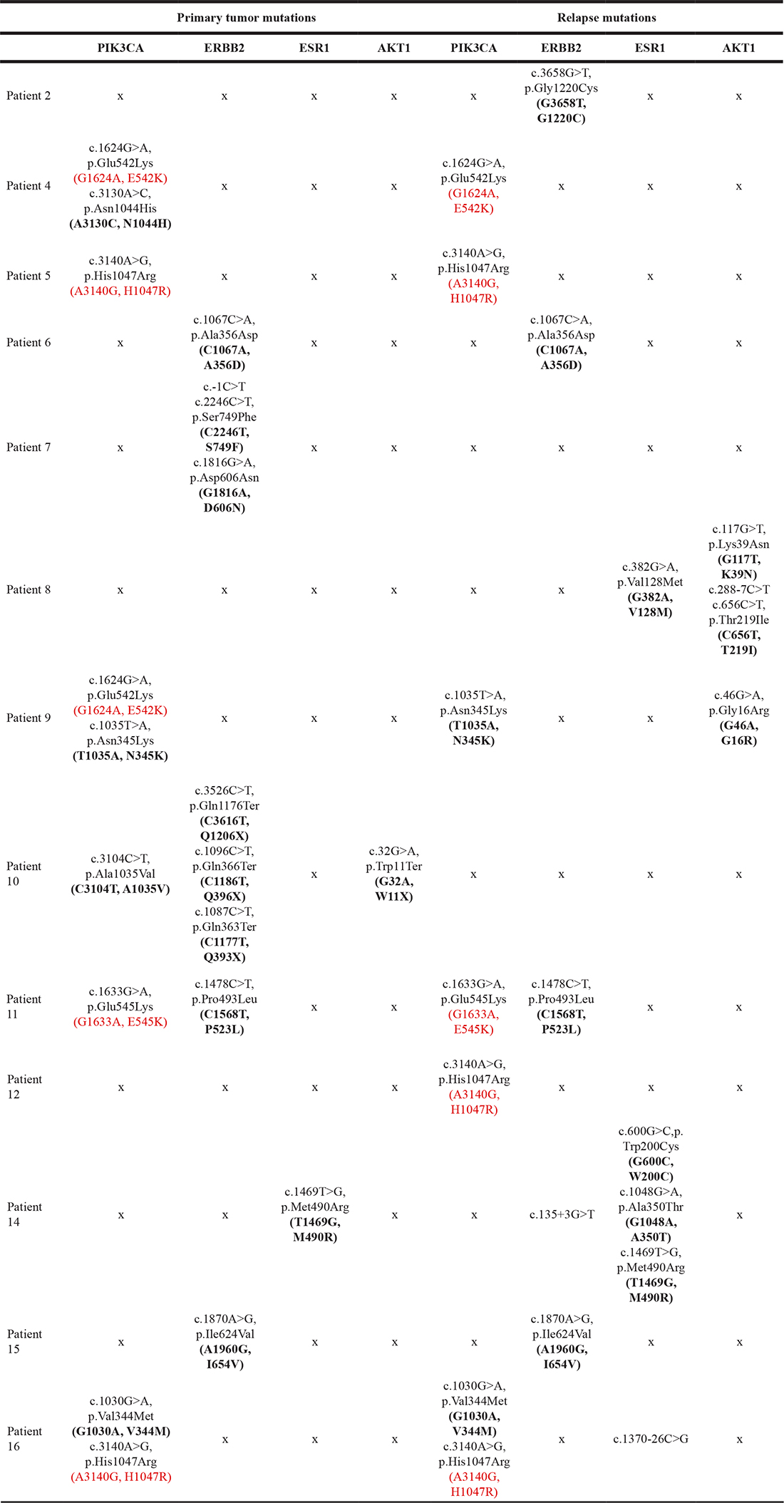 Table 2: Mutations detected in PIK3CA, ERBB2, ESR1 and AKT1 genes