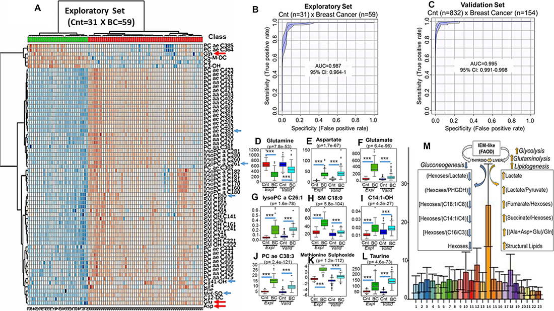 Figure 1: Breast cancer discriminative performance of the top 50 individual metabolites quantified in blood (μmol/L), during exploratory set, using unsupervized clustering analysis with heatmap (A). Arrows are pointing to metabolites whose concentrations in blood (μmol/L) were analyzed by ANOVA during exploratory (Expl) (Red and Green Bars) and confirmed after validation (Valid) set (Dark and Light Blue Bars). The first red arrow at the top (a) show glutamine (Gln), the most abundant amino acid in healthy population (Cnt), whose concentrations, however, became very low in blood of breast cancer women (B, C) (D). On the other hand, the two red arrows at the bottom (A) are pointing to glutamate (Glu) and aspartate (Asp) whose concentrations are high in the blood of the same patients (E and F). This description completely fullfils the concept of “Glutaminolysis” where glutamine is consumed and transformed in glutamate and aspartate. The increased concentrations of sphyngomielins (SM C18:0) (G) and ether lipids (PC ae C38:3) (H) are suggestive that a systemic metabolic shift favoring biosynthesis is predominant in cancer patients. Accumulations, in blood, of acylcarnitines and lipids containing very-long chain fatty acids (C14:1-OH) (I) (lysoPC a C26:1) (J) are common metabolic features of mitochondrial and peroxisomal fatty acids oxidation deficiencies (FAOD) that are, usually followed, by disturbances in ReDOX homeostasis with elevations in oxidative stress and consequent damage to proteins as demonstrated by significant elevations in methionine sulphoxide residues (Met-SO) (K). Elevations in taurine (L), as will be demonstrated ahead, are directly related to increases in blood levels of oncometabolites succinate and fumarate. Figure 1A and 1B are showing the breast cancer discriminative performance during exploratory (A) and validation (B) sets using the equation {PC aa C36:6/[(Xle/Phe)/Tau]}/C102 and the lipid PC aa C28:1 whose absolute concentrations in blood were applied to multivariate ROC curve analysis. Increasing values generated by this metabolic signature were able to accurately segregate breast cancer from controls either during training [AUC = 0.987 (95% CI: 0.964-1), sensitivity = 96.72%, specificity = 96.78%, positive predictive value = 98.33% negative predictive value = 93.94%, average accuracy (100-fold cross validations) = 0.95 and predictive accuracy statistics (1000 permutations) = p < 2.04e-05] or validation sets [AUC = 0.995 (95% CI: 0.991-0.998), sensitivity = 98.09%, specificity = 96.18%, positive predictive value = 82.35%, negative predictive value = 99.64%, average accuracy (100-fold cross validations) = 0.96 and predictive accuracy statistics (1000 permutations) = p < 1.28e-06]. (M) depicts the positive (orange arrows) and negative (blue arrows) correlations among the increasing values of our ratio (Y-Axis) and the oncometabolites succinate, fumarate, lactate and hexoses as well as glutaminolysis (Ala+Asp+Glu/Gln) and structural lipids measured in different metabolic groups (X-Axis): (1)-grade zero metabolic syndrome; (2)-grade 1 metabolic syndrome; (3)-grade 2 metabolic syndrome; (4)-grade 3 metabolic syndrome; (5)-grade 4 metabolic syndrome; (6)-grade 5 metabolic syndrome; (7)-High Risk (RR 1.4) Breast Cancer; (8)-High Risk (RR 1.6) Breast Cancer; (9)-High Risk (RR 1.8) Breast Cancer; (10)-Polycistic Ovary Syndrome; (11)-Colon Cancer; (12)-Lung Cancer; (13)-Hepatocarcinoma; (14)-Breast Cancer; (15)-Hematological Malignancies (Baseline); (16)-Hematological Malignancies (Transplant); (17)-Hematological Malignancies (Engraftment); (18)-Head and Neck Cancer; (19)-Cirrhosis; (20)-Juvenile Arthritis; (21)-Autoimmune Hemolityc Anemia; (22)-Paroxysmal Nocturnal Haemoglobinuria and (23)-Human Immunodeficiency Virus. *** Indicates p < 0.001.