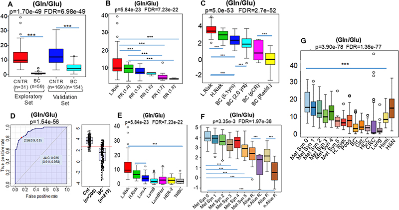 Figure 2: The lower values generated by the ratio (Gln/Glu), a negative surrogate for glutamine metabolism, were: i- able to discriminate breast cancer cases (BC) from controls (CNTR) (A, and D) independent of intrinsic subtypes (E); ii- inversely correlated with increased relative risk (RR) of breast cancer development [RR 1.4 (n = 8) -> 1.5 (n = 11) -> 1.6 (n = 3) -> 1.7 (n = 8) -> 1.8 (n = 3)] (B) and iii- inversely correlated with progressive stages (2) of metabolic syndrome Met Syn 0 (n = 18) -> Met Syn 1 (n = 46) -> Met Syn 2 (n = 32) -> Met Syn 3 (n = 41) -> Met Syn 4 (n = 20) -> Met Syn 5 (n = 9) and also to women with increased chances of death detected initially in the retrospective arm [Alive R. (n = 24) × not Alive R. (n = 8)] with further validation in the prospective setting [Alive P. (n = 67) X not Alive P. (n = 7)] of the european cohort (C). This ratio, besides inverse correlation to breast cancer risk (Low Risk n = 31 X High Risk n = 33) was also inversely correlated with the highest risk of 5 yrs-mortality among patients harboring tumors of 1.0 cm [BC (2.0 yrs) (n = 3) × BC (5.1 yrs) (n = 32)] as well as with the absence of pathologic complete remission (BC pCR, n = 7) when compared to women exhibiting residual disease (BC Resid, n = 52) after neo-adjuvant chemotherapy (F). In (G) results demonstrated enhanced glutamine consumption not only in plasma of patients harboring different adenocarcinomas such as: breast cancer (BC n = 213), colon cancer (CRC n = 85), Lung n = 23 and liver (HCC n = 30), but also in cancer-free subjects with cirrhosis (Cirr. n = 30), polycystic ovary syndrome (PCOS n = 49), high risk of breast cancer development (H.Risk n = 33) and late stage metabolic syndrome (Met Syn 3, 4 and 5). Head and neck squamous cells carcinomas (H&N n = 57) and hematological malignancies (Hem n = 65), apparently, did not share similar glutaminolytic profiles, particularly H&N tumors. *** Indicates p < 0.001.