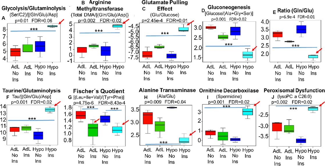 Figure 5: In this murine model, a proxy for human hyperinsulinemia/insulin resistance, only the hypoglycemic mice that received insulin (Hipo Ins) (Light blue bar) recapitulated the MYC-dependent shifts that had been observed in cancer patients, characterized by the insulin/MYC-dependent reactions of i: glutaminolysis and glycolysis (Gln/Glu), (Ser/C2)/[(Gln/Glu)/Asp] and (Ala/Glu) ii: glutamate pulling effect (Glu/Hexoses) iii: arginine methyltransferase activity [Total DMA/[(Gln/Glu)/Asp] and [Tau/[(Gln/Glu)/Asp] iiii: liver function [BCAA/(Phe+Tyr)] (Fischer’s Quotient), ornithine decarboxylase activity (Spermidine), iiiiii: liver neoglucogenesis [Hexoses/(Ala+Gly+Ser)] and iiiiiii: peroxisomal impairment (lysoPC a C26:0) (A–J) (Red arrows). Notably, insulin was able to decrease liver function (Fischer) independent of glucose levels (G), however, decreases in ALT activity (H), neoglucogenesis (D) and peroxisomes function (J) were, exclusivelly seen in hypoglycemic mice that received insulin (Hipo Ins). AdL, ad libitum-feeded mice that did not receive insulin; AdL Ins, ad libitum-feeded mice that received insulin; Hipo No Ins, hypoglycemic mice that did not received insulin; Hipo Ins, hypoglycemic mice that received insulin; *** Indicates p < 0.05.