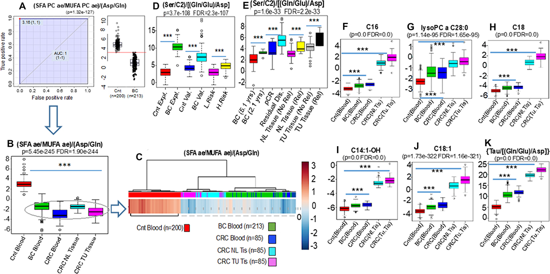 Figure 6: ANOVA and unsupervised clustering comparisons were assembled to compare the blood metabolic phenotypes from controls (Cnt blood n = 200), breast cancer (BC blood n = 213) (A and B) and colon cancer patients (n = 85) (CRC blood) with signatures obtained from both normal colonic epithelium (n = 85) (CRC NL Tissue) with respective colon cancer tissues (CRC TU Tissue) removed surgically from the same 85 CRC patients (B and C). These results demonstrate virtually identical biochemical phenotypes, evidenced by the ratio (SFA/MUFA)/(Asp/Gln), in the blood of breast (Green bar) and colon (Dark blue bar) cancer patients that are quantitatively indistinguishable from the phenotypic deviations detected in the normal colonic epithelium (Light Blue) and its respective colon tumor (Salmon) tissues (B and C). Interestingly, the biochemical disturbances found in both the normal (NL Tissue) and the tumor tissue (TU Tissue) samples from the same colon cancer patients and revealed by the ratio {(Ser/C2)/[(Gln/Glu)/Asp]}, additionally (p = 1.63e-33, FDR = 2.21e-33) identified those with the highest risk of relapse at 5 years (Rel) either after analyzing the normal (NL Tissue Rel) or tumor tissue samples (TU Tissue Rel) (E). This ratio in addition, clearly distinguished breast cancers from controls during exploratory (Expl) and validation (Val) sets as well as women at low (L.Risk) and high risk (RR = 1.8) (H.Risk) of cancer (D). In addition to the blood-based identification of cancer patients, the biochemical deviation identified by this same equation also distinguished i- women with shorter (BC 2.1 yrs) vs. longer (BC 5.1 yrs) relapse-free survival, and ii-women who achieved complete pathological response (pCR) vs. patients with residual disease (Residual Dis) after NAC (p = 3.73e-108, FDR = 2.31e-107) (E). Support for our hypothesis and consistent with the definition of IEM (18), we also detected the accumulation of very long chain acylcarnitines such as C14:1-OH (p = 0.0, FDR = 0.0), C16 (p = 0.0, FDR = 0.0), C18 (p = 0.0, FDR = 0.0) and C18:1 (p = 1.73e-322, FDR = 1.16-321) and lipids containing VLCFA (lysoPC a C28:0) (p = 1.14-e95, FDR = 1.65e-95) not only in the blood of breast and colon cancer patients but, importantly, in both the normal tissues and the tumor tissues from colon cancer patients (F–K). SFA, Sum of saturated acyl-alkyl phosphatidylcholines containing more than 36 carbons; MUFA, Sum of monounsaturated acyl-alkyl phosphatidylcholines containing more than 36 carbons.