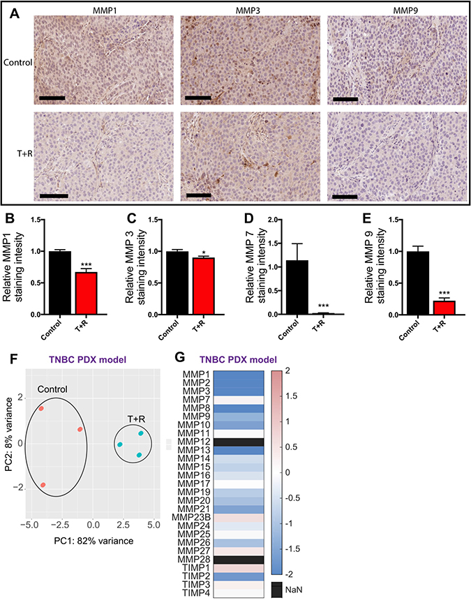 We also used the data from RNA sequencing to gain further insights into the down regulation of MMPs in the PDX tumors that were treated with T+R. Of the 23 MMPs and 4 TIMPs that we investigated 17 were downregulated in the T+R condition. As shown by our PCR data, expression of MMP 11 was unaffected by the treatment (Figure 4G). This data together with the previous data demonstrates that T+R successfully downregulates MMP expression which contributes to the decreased metastasis observed with the T+R treatment.