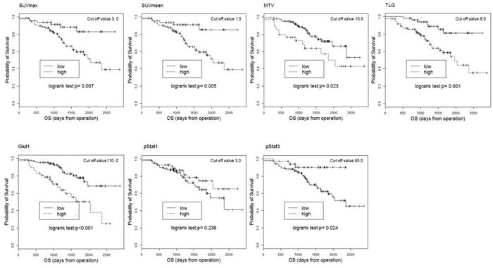 The relationships between all PET parameters and various clinicopathological variables or molecular markers were evaluated using the Wilcoxon rant test and Spearman's rank correlation test. Using the cut-off values, we estimated the survival functions of OS and those of DFS for the low and high groups by the Kaplan-Meier method, and we compared these functions by the log-rank test.