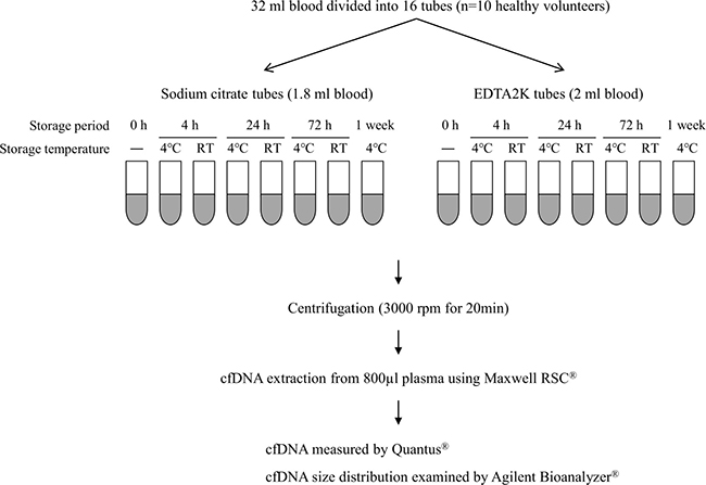 Figure 1: Schema for examining effects of anticoagulant and storage condition on quality of cfDNA. A total of 32 ml blood was collected from each of ten healthy volunteers and divided into eight sodium citrate tubes and eight EDTA 2K tubes. Blood in each collection tube was stored at 4° C or RT for the indicated period. Plasma separation and cfDNA extraction were performed as shown in this figure. cfDNA quality was evaluated by measuring cfDNA concentration with Quantus® and by analyzing cfDNA size distribution with Agilent Bioanalyzer®.