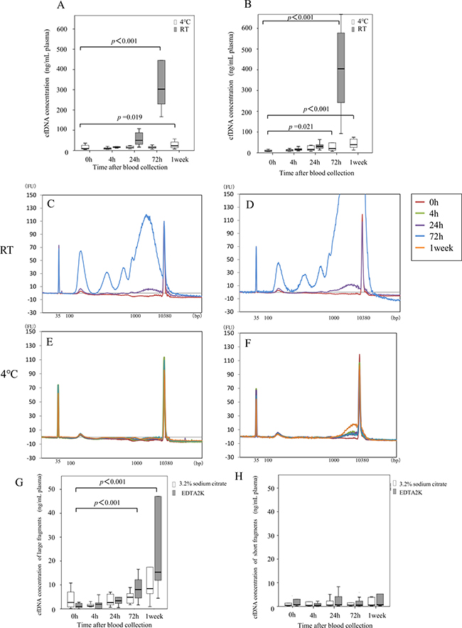 Next, we describe the cfDNA size distribution. A representative result from each condition is shown in Figure 2 for sodium citrate tubes (Figure 2C, 2E) and for EDTA 2K tubes (Figure 2D, 2F). When blood was stored at 4° C, a single peak at 170 bp was observed with sodium citrate tubes (Figure 2E). However, large cfDNA from 1–9 kB appeared with EDTA 2K tubes 72 h after blood collection (Figure 2F). With storage at RT, the amount of large cfDNA increased 1 week after blood collection with both tube types (Figure 2C, 2D). Results with samples obtained from other healthy volunteers were similar (data not shown). To further evaluate cfDNA size distribution, because large fragment size is considered to represent contamination by genomic DNA, we measured cfDNA concentrations in two classes of fragment size after storage at 4° C: large fragments (1–9 kb, Figure 2G) and small fragments (100–250 bp, Figure 2H). The concentrations of large fragments after storage at 4° C were significantly higher at 72 h with EDTA 2K tubes but not with sodium citrate tubes (Figure 2G). However, concentrations of short fragments after storage at 4° C did not change until 1 week with either type of tube (Figure 2H). These results suggest that blood samples should be stored at 4° C, and plasma separation should be made within 72 h with sodium citrate tubes to maintain quality of cfDNA.