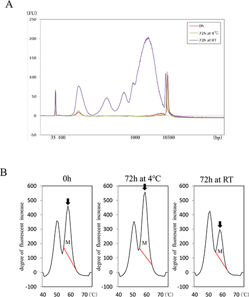 Figure 3: Influence of anticoagulant and blood preservation on quality of cfDNA from a patient with NSCLC harboring EGFR mutation. cfDNA size distributions (A) in samples stored at 4° C or RT were compared in blood collected into sodium citrate tubes. Area under mutation peak (AUM) of L858R was examined with MBP-QP (B). Arrows indicate mutation peaks. AUM for L858R (indicated as M) was defined as the integral under the curve between 56° C and 68° C and was calculated by the i-densy AreaAna® software.