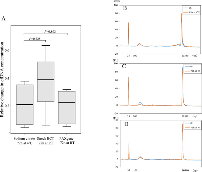 Figure 4: Comparison of cfDNA quality between sodium citrate tubes and cell-stabilizing tubes. Relative change of cfDNA concentration in blood from five healthy volunteers was calculated as concentration after 72 h storage divided by concentration just after blood collection using sodium citrate tubes, Streck BCT, and PAXgene tubes (A). Statistical analyses were performed with Friedman’s rank test. Size distribution of cfDNA using the 3 kinds of blood collection tubes was analyzed with an Agilent bioanalyzer®; representative examples are shown for sodium citrate tubes (B), Streck BCT tubes (C), and PAXgene tubes (D).