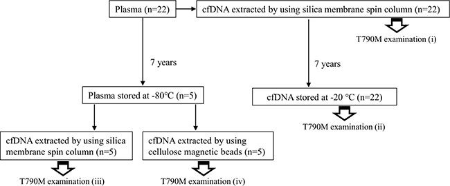 Figure 5: Experimental design for analysis of influence of long-term storage on cfDNA and plasma. Blood samples were obtained from 22 patients with advanced lung cancer harboring EGFR T790M mutation detected 7 years previously. The EGFR T790M test was performed with MBP-QP immediately after blood collection and DNA extraction (i), and again 7 years after storage of cfDNA at −20° C (ii). Five plasma samples among the 22 patients were stored at −80° C for 7 years. cfDNA was isolated from these five plasma samples with two different isolation methods: silica membrane spin column (iii) and cellulose magnetic beads system (iv).