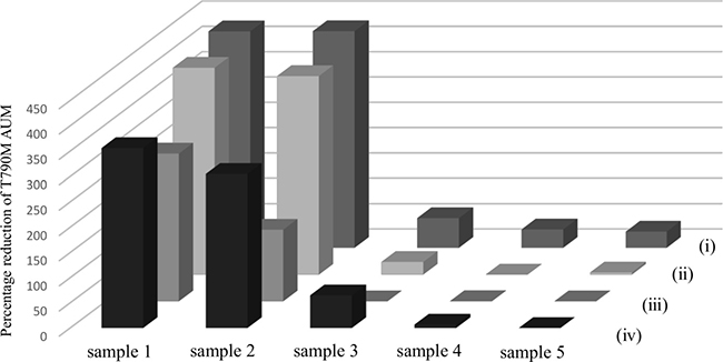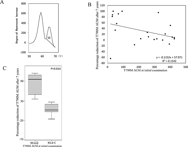 Figure 6: Influence of long-term storage of cfDNA on mutation detection. The definition of AUM (indicated as M) is shown (A) The correlation between percentage reduction of T790M AUM after 7 years and the initial value of AUM (step (i) in Figure 5) was analyzed (B) The percentage reduction was calculated as [T790M AUM at initial examination (i) - T790M AUM after 7 years (ii)]/[T790M AUM at initial examination (i)]. Samples were divided into two groups on the basis of whether percentage reduction of T790M AUM after storage for 7 years was above or below the cut-off value 96.3 determined as the level that corresponded with 50% reduction according to the regression line (C) Freidman’s test was used for analysis.
