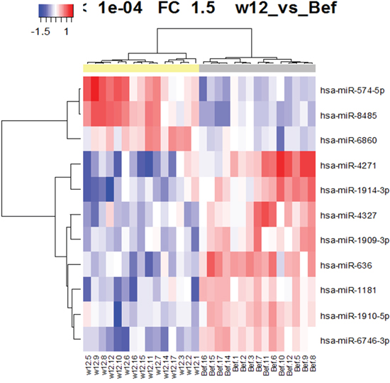 Figure 2: Hierarchical clustering of the 11 miRNAs expressed between before and 12 weeks after the start of OBV/PTV/r treatment (p<0. 0001).