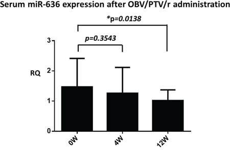 Circulating miR-636 expression in serum is down-regulated 12 weeks after the start of OBV/PTV/r treatment