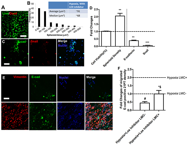 Figure 6: Effects of LOX inhibitor on 21PT viability, EMT, and migration. (A) Representative live/dead image of 21PT within hydrogels with addition of LOX inhibitor (scale bars = 200 μm); (B) Cell spheroid area distribution; (C) Representative IF staining showed that less E-cad and Snail expression with addition of LOX inhibitor (scale bars = 100 μm); (D) Semi-quantitative measurement of fold changes of cell viability, spheroid density, positive E-cad and Snail cell density comparing between with and without LOX inhibitor; (E) Representative IF staining for vimentin (red), E-cad (green) and nuclei (blue) for migrated 21PT and LMC with LOX inhibitor after 14-day culture (scale bars = 100 μm); (F) Semi-quantitative measurement of fold changes of migrated 21PT density with LOX inhibitor comparing to with and without LMC without LOX inhibitor (n=5; # indicates significant decrease of migrated 21PT comparing to hypoxia LMC- condition; $ indicates significant decrease of migrated 21PT comparing to hypoxia LMC+ condition; * indicates significant increase of migrated 21PT comparing to hypoxia LMC- with LOX inhibitor; p<0.05).