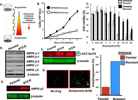 Figure 1: Bortezomib-resistant myeloma cells. (A) Scheme used to generate bortezomib-resistant cells. (B) Growth rate comparison of parental and drug-resistant cells as measured by trypan blue staining. (C) Viability of parental and bortezomib-resistant cells after bortezomib addition at the indicated concentrations. Viability was determined using the XTT assay and the values represent the arithmetic mean of triplicate measurements and error bars represent the standard deviation. (D) Western blot to compare the level of individual AMPK subunits in the parental and bortezomib-resistant cells. Lysates from parental or resistant cells were probed using antibodies to the AMPK alpha 1/2, beta 1/2 and gamma 1/2 subunits. (E) Western blotting to compare the level of AMPK alpha-2 subunit in parental and bortezomib-resistant cells. (F) Western blotting to compare the level of phospho-Ser79 ACC in parental and drug-resistant myeloma cells. (G) Confocal microscopy to detect autophagosomes. Cells treated with bortezomib, pelleted, incubated with the cyto-ID green detection reagent, applied to a microscope slide and visualized using a Zeiss LSM170 confocal microscope . (H) Quantitation of autophagosomes in parental and drug-resistant cells. Cells were incubated with the cyto-ID detection reagent and autophagosomes quantitated by flow cytometry. Shown is the result of triplicate measurements.