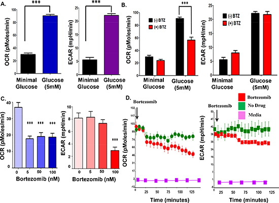 Figure 2: Bortezomib effect on the OCR and ECAR in parental myeloma cells. (A) Glucose effect on the OCR and ECAR in parental myeloma cells. (B) Bortezomib effect on the OCR and ECAR of parental myeloma cells. Cells were grown in minimal or 5 mM glucose for 24 hours prior to measurements. (C) Dose-dependent effect of bortezomib on the OCR and ECAR measurements. (D) Real-time measurements to determine the effect of bortezomib on OCR and ECAR in parental myeloma cells. Bortezomib was injected directly into wells that contained RPMI8226 cells and recorded over 150 minutes.