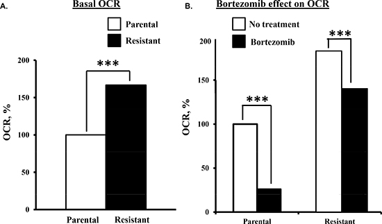 Figure 3: Comparison of the bortezomib effect on parental and bortezomib-resistant cells. (A) Basal OCR measurements in parental and bortezomib-resistant cells. (B) Parental and bortezomib-resistant cells were treated with bortezomib (10 nM) and OCR then measured.