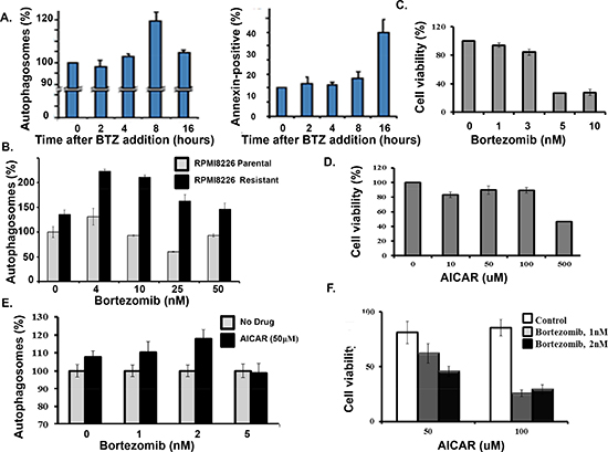 Figure 5: AICAR effect on bortezomib-induced cell death. (A) Time course of bortezomib effect on autophagosome formation and apoptosis in myeloma cells. Autophagosomes were quantitated using the dye-based cytoID reagent and flow cytometry. The percentage of annexin-positive cells was determined by flow cytometry. Shown are the results of triplicate measurements. Error bars represent the standard deviation. (B) Autophagosome formation in drug-sensitive and drug-resistant myeloma cells. (C) Effect of bortezomib on myeloma cell viability. Cells were treated with bortezomib at indicated concentrations and viability determined by the XTT assay. Shown are the results of triplicate measurements. Error bars represent the standard deviations. (D) AICAR effect on myeloma cell viability. Cells were treated with bortezomib at indicated concentrations and viability determined by the XTT assay. Shown are the results of triplicate measurements. Error bars represent the standard deviations. (E) AICAR effect on bortezomib-induced autophagosome formation. (F) AICAR effect bortezomib-induced cell death. Cells were treated with bortezomib at indicated concentrations and viability determined by the XTT assay. Shown are the results of triplicate measurements. Error bars represent the standard deviations.
