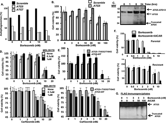 Figure 6: Effect of AICAR on ATG5. (A) Effect of Atg5 or Atg7 silencing in myeloma cells on bortezomib-induced autophagosome formation. (B) Effect of Atg5 silencing in myeloma cells on bortezomib treatment and cell viability. Cells were treated with bortezomib at indicated concentrations and viability determined by the XTT assay. Shown are the results of triplicate measurements. Error bars represent the standard deviations. (C) Effect of bortezomib on ATG5 conjugation to ATG12 as well as cleavage of ATG5. Myeloma cells were treated with bortezomib for indicated times, total protein precipitated and precipitates probed using an antibody specific for ATG5. Shown is the ATG5-ATG12 conjugate (52 kDa), ATG5 (36 kDa) and truncated ATG5 form (24 kDa) detected by western blot. (D) Effect of the calpain inhibitor MDL28170 on myeloma cells treated with bortezomib. At the concentrations of 0.1 or 1uM, MDL28170 was not toxic to myeloma cells. Viability was determined using the XTT assay. Values represent the arithmetic mean of triplicate measurements and error bars represent the standard deviation. (E) Effect of the calpain-resistant ATG5 mutant on bortezomib treatment of myeloma cells. Cells were transfected with plasmids that expressed either Atg5-WT or an Atg5 mutant (T193G-T194G). Myeloma cells were treated with bortezomib at indicated concentrations and viability was determined using the XTT assay. Values represent the arithmetic mean of triplicate measurements and error bars represent the standard deviation. (F) Effect of AICAR addition on parental and drug-resistant myeloma cells treated with bortezomib. Myeloma cells were treated with bortezomib at indicated concentrations and viability was determined using the XTT assay. Values represent the arithmetic mean of triplicate measurements and error bars represent the standard deviation. (G) Myeloma cells were transfected with a plasmid that expressed FLAG-tagged Bcl2. Cells were then treated with bortezomib, lysates prepared and immunoprecipitated using an anti-FLAG antibody. Immunoprecipitates were separated by SDS-PAGE and probed using an anti-ATG5 antibody to detect the ATG5 forms association with FLAG-tagged Bcl2.