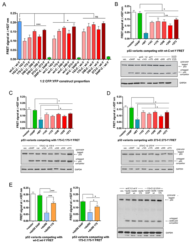 Wt p53 competed significantly more strongly than any of the five hot-spot mutant p53 variants transfected at equimolar vector amounts with the FRET generated by 1:2 vector proportion of wt-CFP:wt-YFP (Figure 2B). In these experiments western blots were used to confirm uniform levels of the competing p53 variants (Figure 2B–2E). Interestingly, wt p53 variant competed more efficiently than p53 mutants not only with wt:wt FRET but also with FRET generated between mutant variants R175H and R273H (Figure 2C–2D), albeit this effect was less significant than in the case of wt:wt FRET competition assay. The monomeric L344P p53 variant had no effect on the FRET signal and was used as the control reference (Figure 2A–2D).