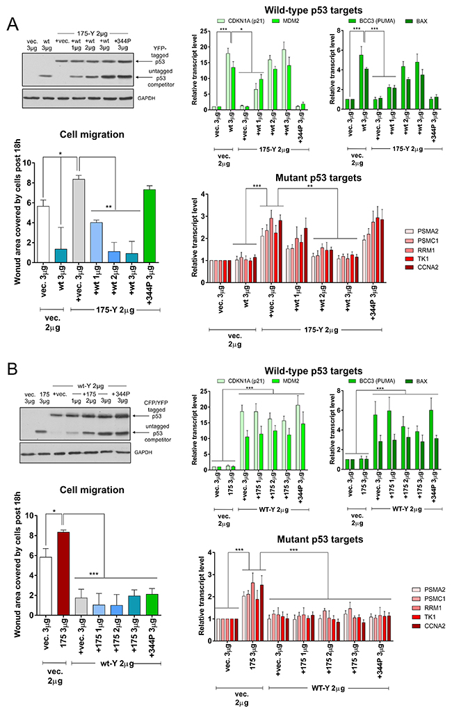 Figure 4: Wild-type and mutant p53 hetero-oligomerization leads to inefficient wt p53 activity inhibition and efficient mutant p53 gain-of-function inhibition. (A) H1299 cells were transfected with indicated amounts of empty vector (vec.) and/or vectors encoding p53 protein variants – untagged wt or 344P with/without 175-YFP mutant. The western blot shows p53 (DO-1 antibody) and GAPDH (housekeeping control) levels in the representative competition titration experiment. Expression bar graphs show normalized averages with SD of the mRNA levels for wt p53 target genes (strongly induced: CDKN1A and MDM2; moderately induced: BCC3 and BAX) and mutant p53 target genes (PSMA2, PSMC1, RRM1, TK1, CCNA2) in 3 biological replicates of the wt p53 titration vs p53 175-Y mutant variant. The cell migration graph shows average results with SD of area covered by cells post 18h of the wound-healing (scratch) assay in 3 biological replicates of the wt p53 titration vs p53 175-Y mutant variant. Statistical significance was calculated with one-way ANOVA, Bonferroni post-test, *** p-value<0.001, ** p-value<0.01, * p-value<0.05. The result indicates that significant inhibition of the mutant p53 GOF effects (gene expression and cell migration induction) by wt p53 is present already at equimolar amount of wt vs. mutant p53. (B) H1299 cells were transfected with indicated amounts of empty vector (vec.) and/or vectors encoding p53 protein variants – untagged 175H or 344P with/without wt-YFP. The western blot shows p53 (DO-1 antibody) and GAPDH (housekeeping control) levels in the representative competition titration experiment. Expression bar graphs show normalized averages with SD of the mRNA levels for wt p53 target genes (strongly induced: CDKN1A and MDM2; moderately induced: BCC3 and BAX) and mutant p53 target genes (PSMA2, PSMC1, RRM1, TK1, CCNA2) in 3 biological replicates of the mutant R175H p53 titration vs wt-Y. The cell migration graph shows average results with SD of area covered by cells post 18h of the wound-healing (scratch) assay in 3 biological replicates of the R175H mutant p53 titration vs wt-Y. Statistical significance was calculated with one-way ANOVA, Bonferroni post-test, *** p-value<0.001, * p-value<0.05. The result indicates that inhibition of the wt p53 effects (gene expression induction and cell migration inhibition) by mutant p53 is ineffective even at excess of mutant vs. wt p53.