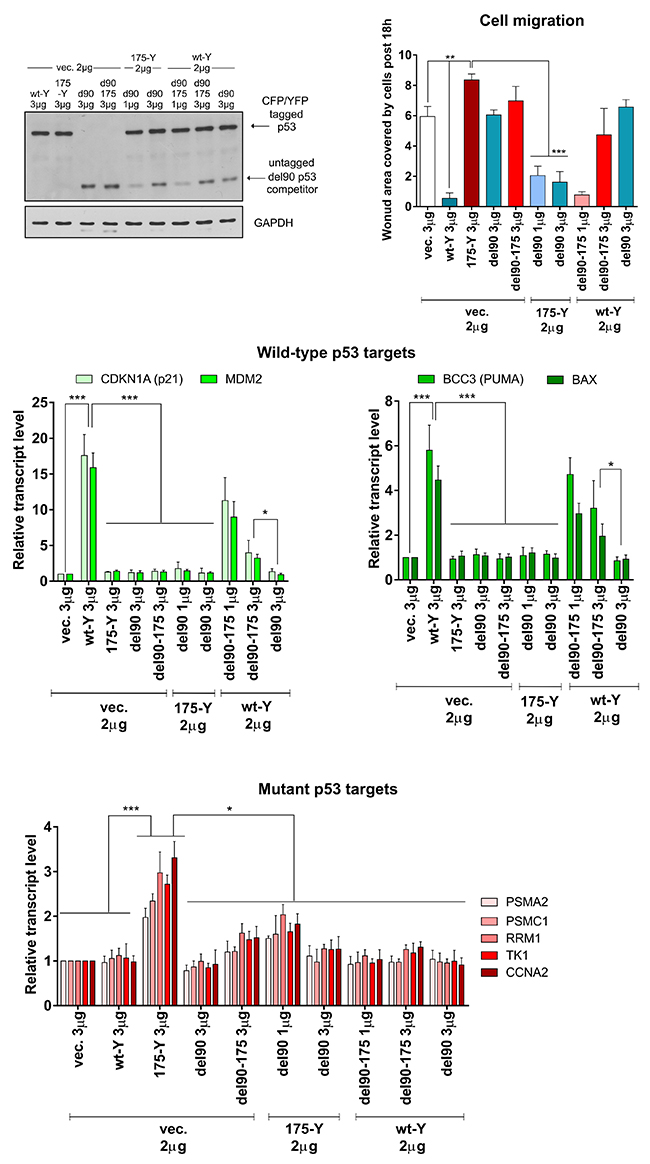 Figure 5: Del90 p53 variant, without the wt p53 transactivation domain and activity, efficiently inactivates the mutant p53 gain-of-function. H1299 cells were transfected with indicated amounts of empty vector (vec.) and/or vectors encoding p53 protein variants – untagged del90 or del90 with R175H mutation, with/without 175-YFP or wt-Y. The western blot shows p53 variants (DO-12 antibody) and GAPDH (housekeeping control) levels in the representative experiment. Expression bar graphs show normalized averages with SD of the mRNA levels for wt p53 target genes (strongly induced: CDKN1A and MDM2; moderately induced: BCC3 and BAX) and mutant p53 target genes (PSMA2, PSMC1, RRM1, TK1, CCNA2) in 3 biological replicates. The cell migration graph shows average results with SD of area covered by cells post 18h of the wound-healing (scratch) assay in 3 biological replicates. Statistical significance was calculated with one-way ANOVA, Bonferroni post-test, *** p-value<0.001, ** p-value<0.01, * p-value<0.05. The result indicates that significant inhibition of the mutant p53 GOF effects (mutant p53-specific gene expression and cell migration induction) is possible by the del90 p53, while the wt p53 effects (wt p53-specific gene expression induction and cell migration inhibition) are more efficiently inhibited by del90 p53 rather than del90 p53 with the hot-spot R175H mutation.