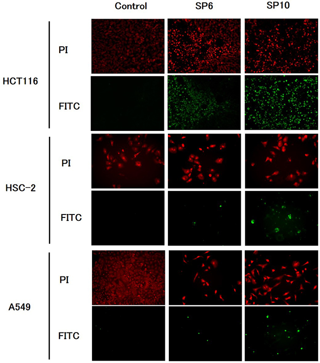Figure 3: TUNEL staining of cancer cells in vitro. Cultured HCT116, HSC-2, A549, and MCF-7 cells were treated with different concentrations of SP6 and SP10 for 72 h, and TUNEL staining was performed to detect apoptosis. The concentrations of SP6 used were as follows: HCT116: 10 μg/mL, HSC-2: 100 μg/mL, and A549: 100 μg/mL. The concentrations of SP10 used were as follows: HCT116: 6.5 μg/mL, HSC-2: 50 μg/mL, and A549: 50 μg/mL. PI-stained nuclei were red in color. Apoptotic cells detected as FITC-positive cells were green in color. Apoptotic cells were detected in both the SP6 and SP10 treatment groups.