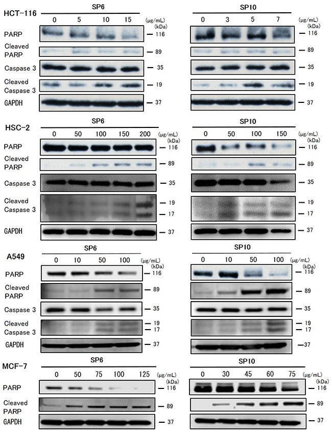 Figure 4: Western blot analysis of apoptosis in cancer cells in vitro. Cultured HSC-2, A549, and MCF-7 cells were treated with different concentrations of SP6 and SP10 for 72 h. Then the cells were harvested and expression of the indicated proteins was analyzed. SP6 and SP10 induced expression of the apoptotic markers, cleaved caspase 3 and cleaved PARP.