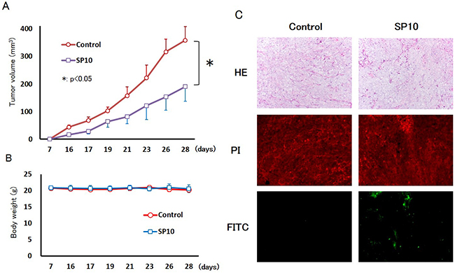 Figure 5: Anti-tumor effects of SP10 in an HCT116 tumor xenograft model. (A) HCT116 cells (3×106 per animal) were implanted subcutaneously into the right back flank of mice, and treatment commenced 7 days after tumor injection. SP10 (200 mg/kg orally, given 5 days/week for 21 days) effectively inhibited the growth of HCT116 allografts in vivo (*p<0.05). (B) Body weight did not change during the experiment. (C) TUNEL staining revealed apoptotic cells in the tumor tissue of the SP10 treatment group. Hematoxylin and eosin (H&E) staining was conducted of both the nuclei and cytoplasm. PI-stained nuclei were red in color. Apoptotic cells detected as FITC-positive cells were green color. Apoptotic cells were detected in SP10-treated tissue.