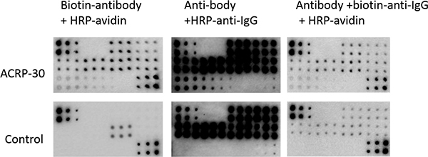 Figure 2: RPPA detection system tested with different antibody labeling options. Serum samples and serially diluted standard antigen were printed directly on NC membranes. Protein expression was determined with the corresponding antibody with different labeling combinations and ECL detection. ACRP30 in serum samples and serially diluted pure standard with a concentration from 2000 ng/ml to 31.25 ng/ml was detected with a biotin-labeled anti-acrp30 antibody and HRP-labeled avidin (top left panel), or an anti-acrp30 antibody with a HRP-labeled Anti-IgG antibody (top middle panel), or an anti-acrp30 antibody with a biotin-labeled Anti-IgG and a HRP-labeled avidin (top right panel). The respective controls use the same antibody combination but without the anti-acrp30 antibody (bottom panels).