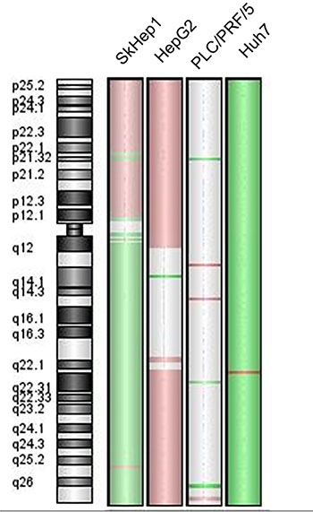 Figure 1: Chromosome 6 genomic profile of the cell-lines SkHep1, HepG2, PLC/PRF/5 and Huh7. The green colour on the chromosome ideogram indicates loss of the fragment, the red indicates gain and the grey indicates a balanced status.