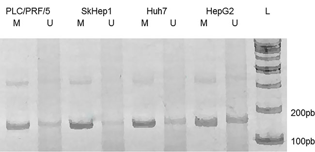 To study the methylation state of the P1 promoter of the PLAGL1 gene we performed MS-PCR. All cell lines presented a fraction of DNA methylated and another unmethylated. However, conspicuous differences in terms of intensity of the bands corresponding to these fractions were observed after gel electrophoresis in three cell lines. HepG2 was the only cell line in which the DNA-band of methylated P1 promoter was rather similar to that of unmethylated promoter, whereas in the SkHep1, Huh7 and PLC/PRF/5 cell lines the methylated DNA fraction was much more intense than the unmethylated fractions (Figure 2).