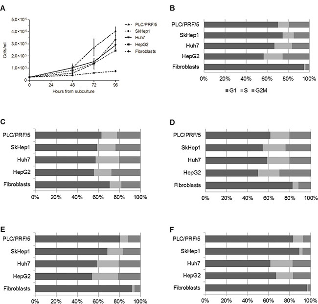Figure 3: HepG2, Huh7, SkHep1 and PLC/PRF/5 cells proliferate faster than non-tumoral fibroblasts. (A) Aliquots of 25 × 103 cells/ml were seeded in 4 flasks and cultured in 10 ml of DMEM medium containing 10% FBS for 24, 48, 72 and 96 h. At each time point, the cells were harvested, and their number counted in a Neubauer chamber. Fibroblasts have a constant growth during the experiment and reached 7.5 × 104 cells/ml at 96 h, in contrast to the 2.5–4.5 × 105 cells/ml reached by HCC cells at the same time point. (B–F) Show the percentage of cells in each phase of the cell cycle at 0 h, 24 h, 48 h, 72 h and 96 h, respectively.