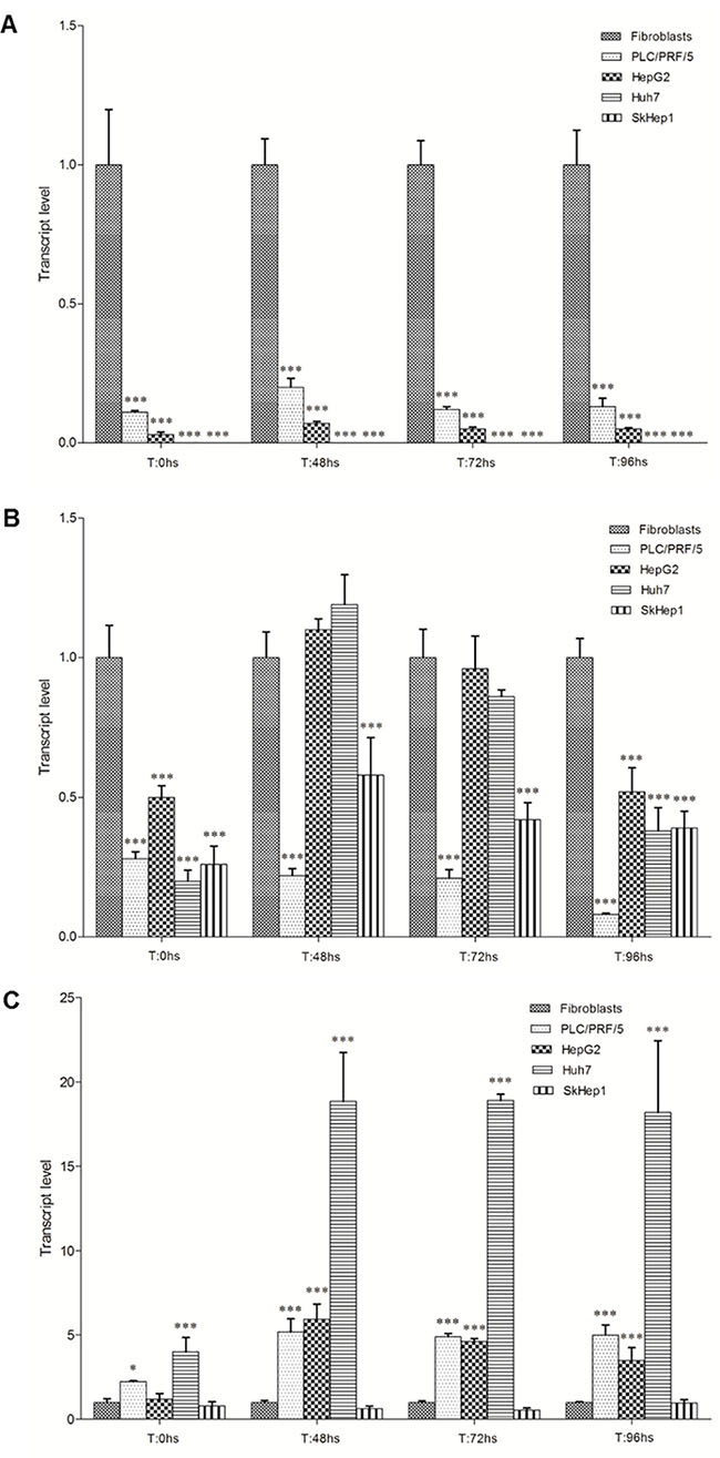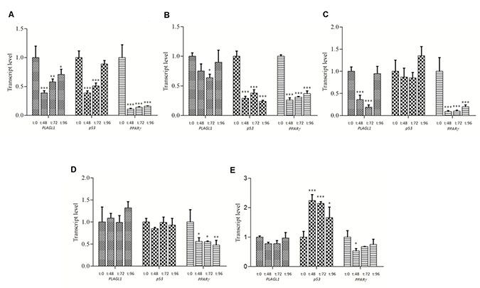 Figure 5: PLAGL1, p53 and PPARy transcript level during in vitro cell growth. (A) Fibroblasts. (B) PLC/PRF/5. (C) SkHep1. (D) HepG2. (E) Huh7. The statistical comparisons were made between any given time point and T = 0 h for each cell line individually. Bars represent mean ± SD. Asterisks indicate that the difference is significant; *p < 0.05, **p < 0.001, ***p < 0.0001.